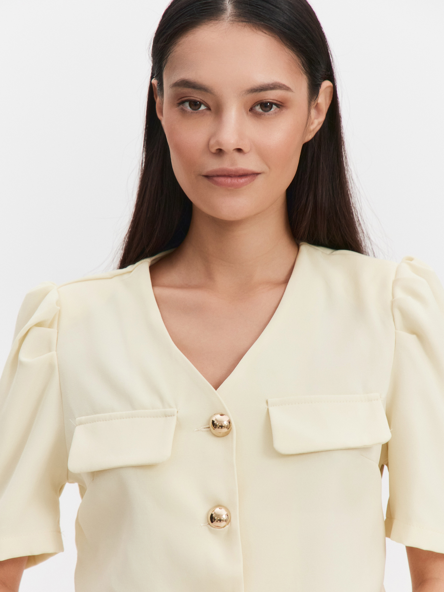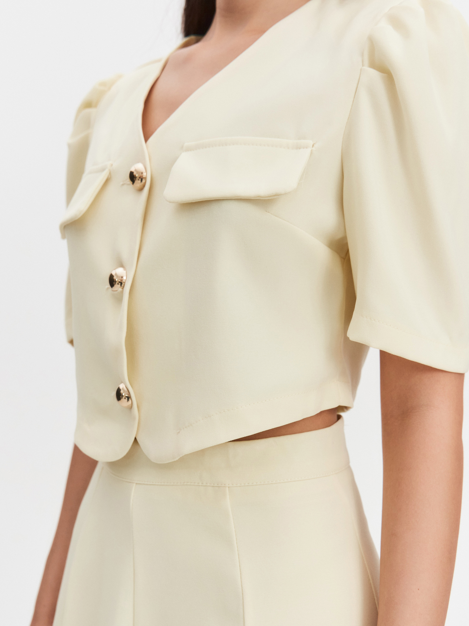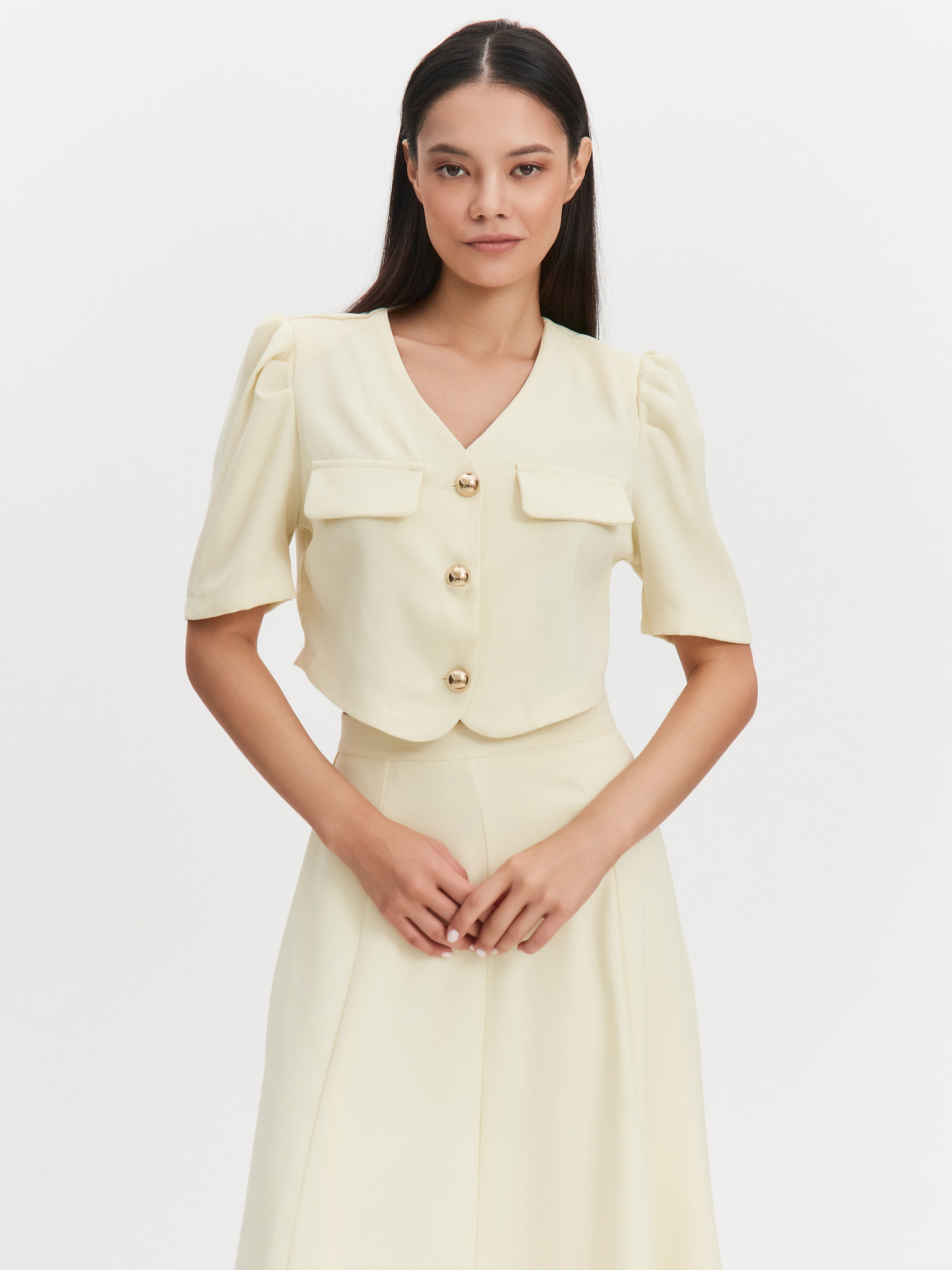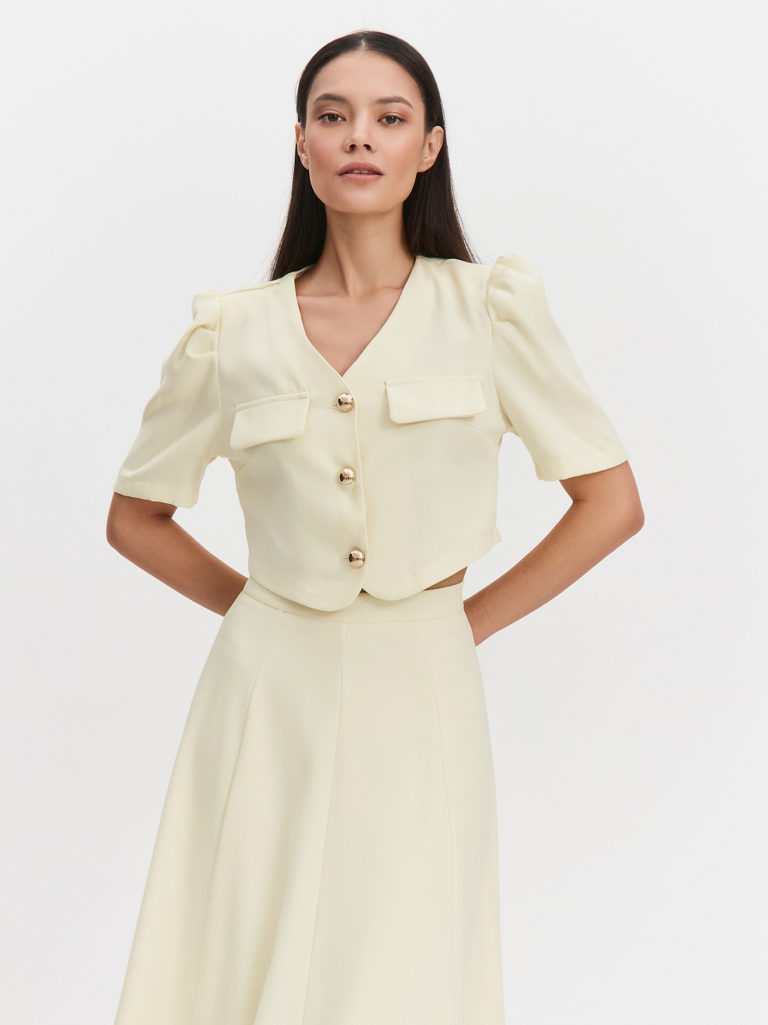 Костюм из двух позиций. Укороченный топ на пуговицах с рукавами фонариками в трендовом сливочном оттенке. Юбка полусолнце с поясом подчеркнет линию талии и визуально удлинит ноги. Костюм подойдет как для деловых встреч, так и романтических прогулок.