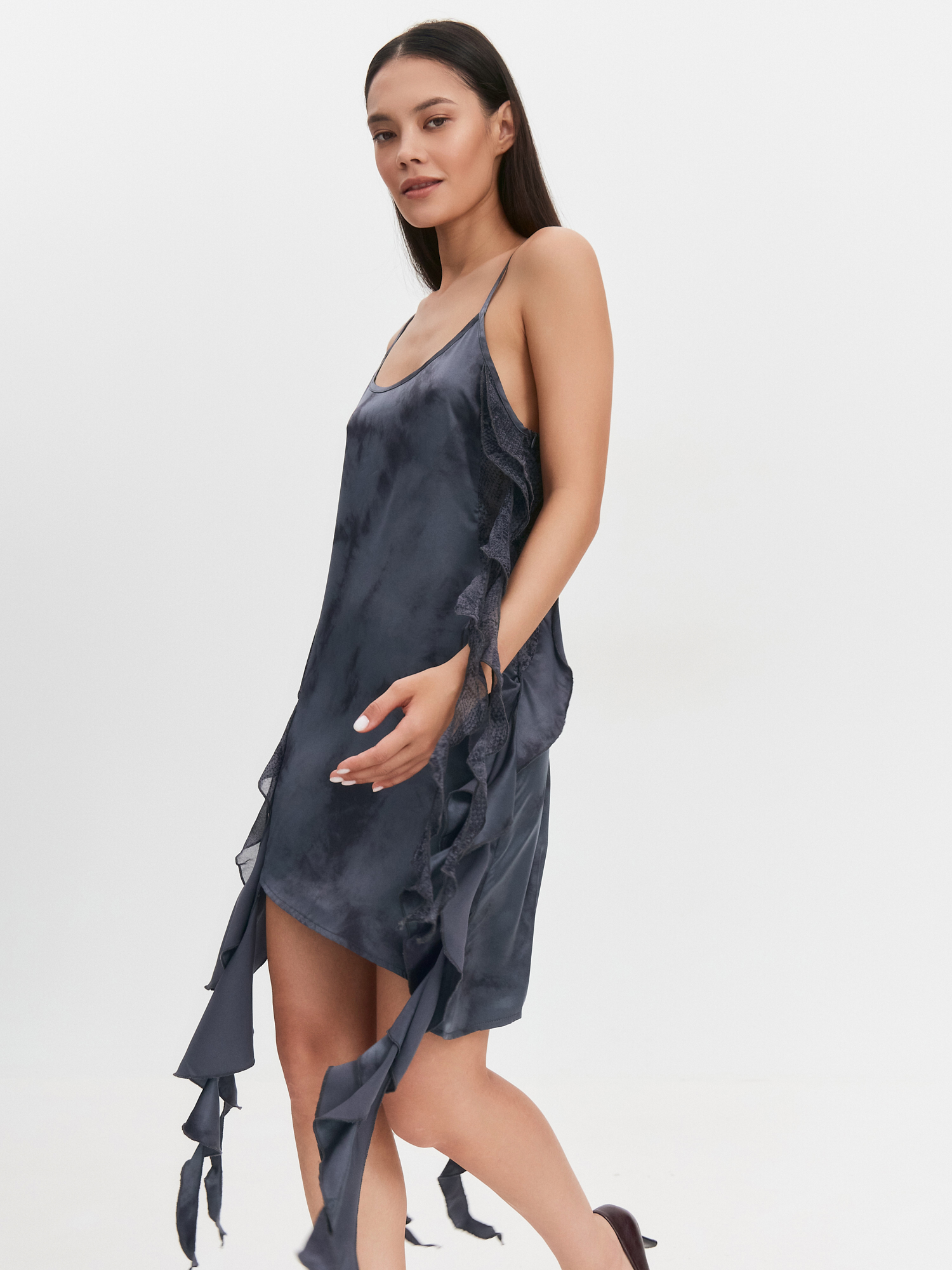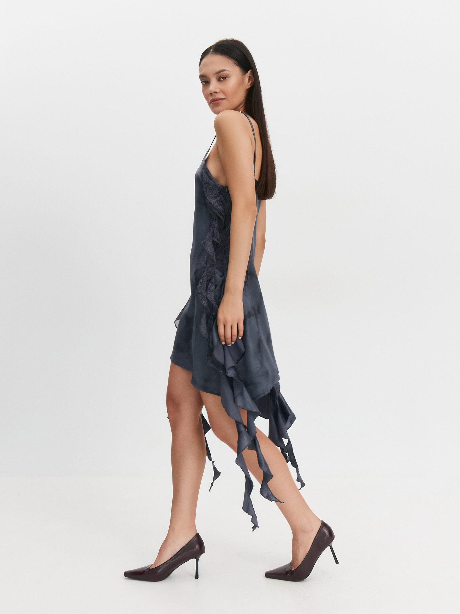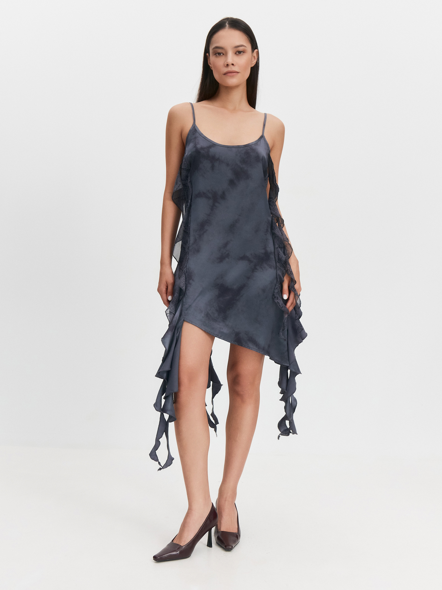Платье мини с кружевной отделкой и рюшами на тонких бретелях. Идеально для прогулок по набережной или романтического вечера.