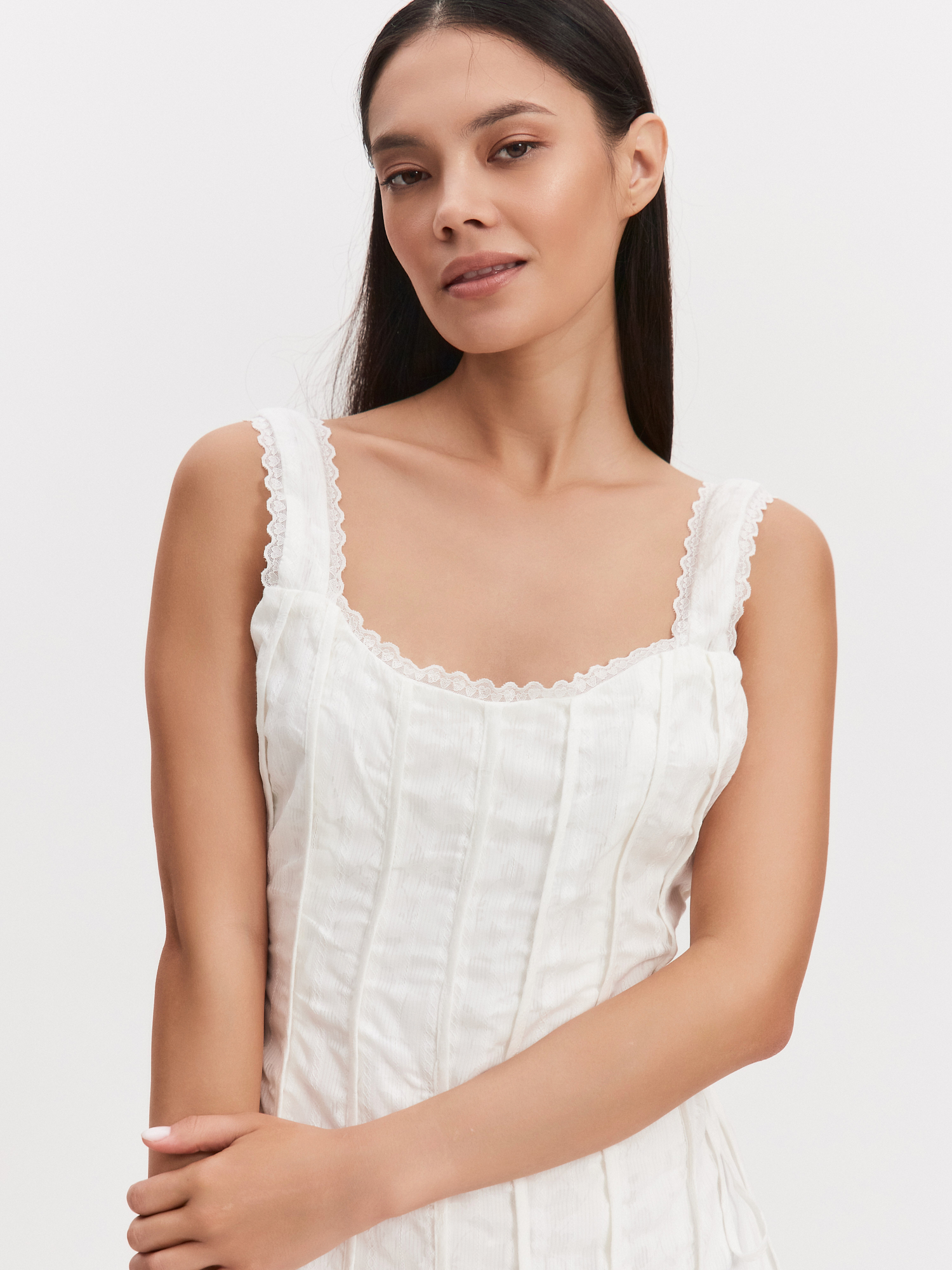 Стильное платье мини на широких бретелях в белом цвете. Идеально для прогулок по летнему городу, путешествий или свиданий.