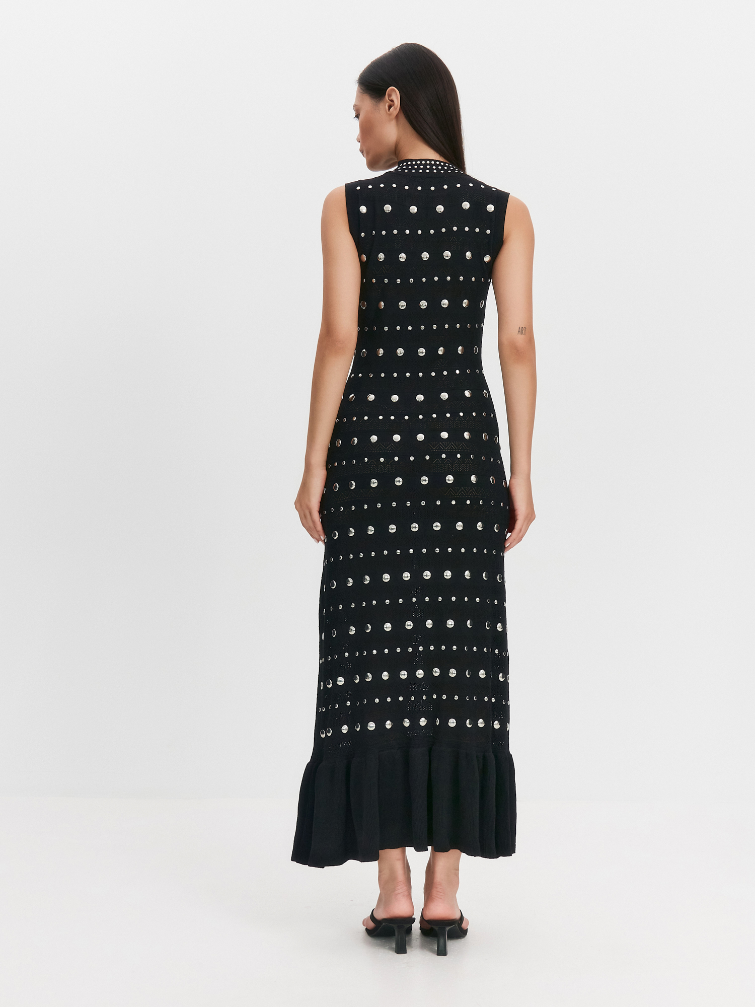 Трикотажное платье макси без рукавов с пайетками и воротником стойкой. Дышащее, с воланами по низу подчеркнет женственные формы.